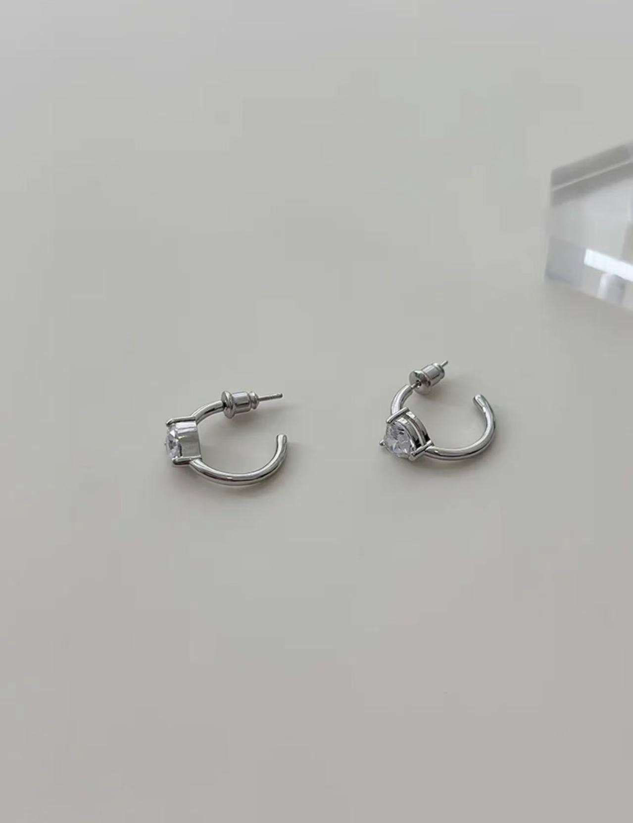 At the front of each earring sits a clear round gemstone that serves as the visual centerpiece of the design. The stone is noticeably prominent in size compared to the metal arc, allowing it to catch light and draw attention effortlessly. Precision-cut facets reflect light from multiple angles, producing bright flashes and crisp sparkle.