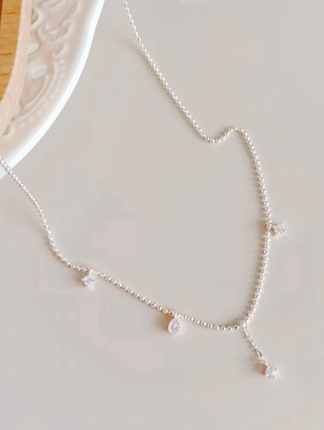 The Celeste Drop Necklace is a refined piece designed with a balance of delicate texture and modern asymmetry. The necklace features a fine silver-toned beaded chain made of evenly spaced small metal spheres, creating a subtle shimmer that sits comfortably along the neckline in a short-chain style.