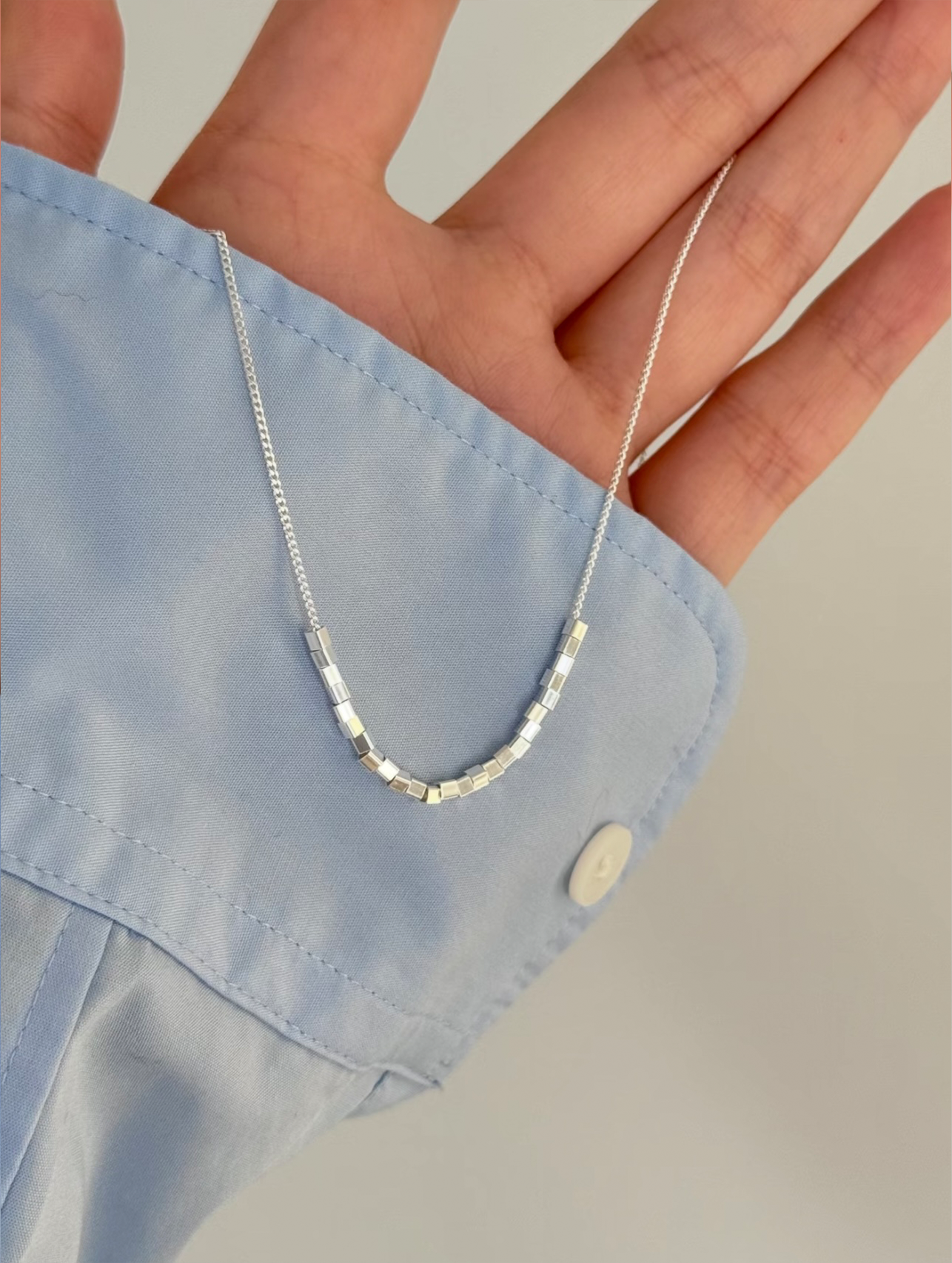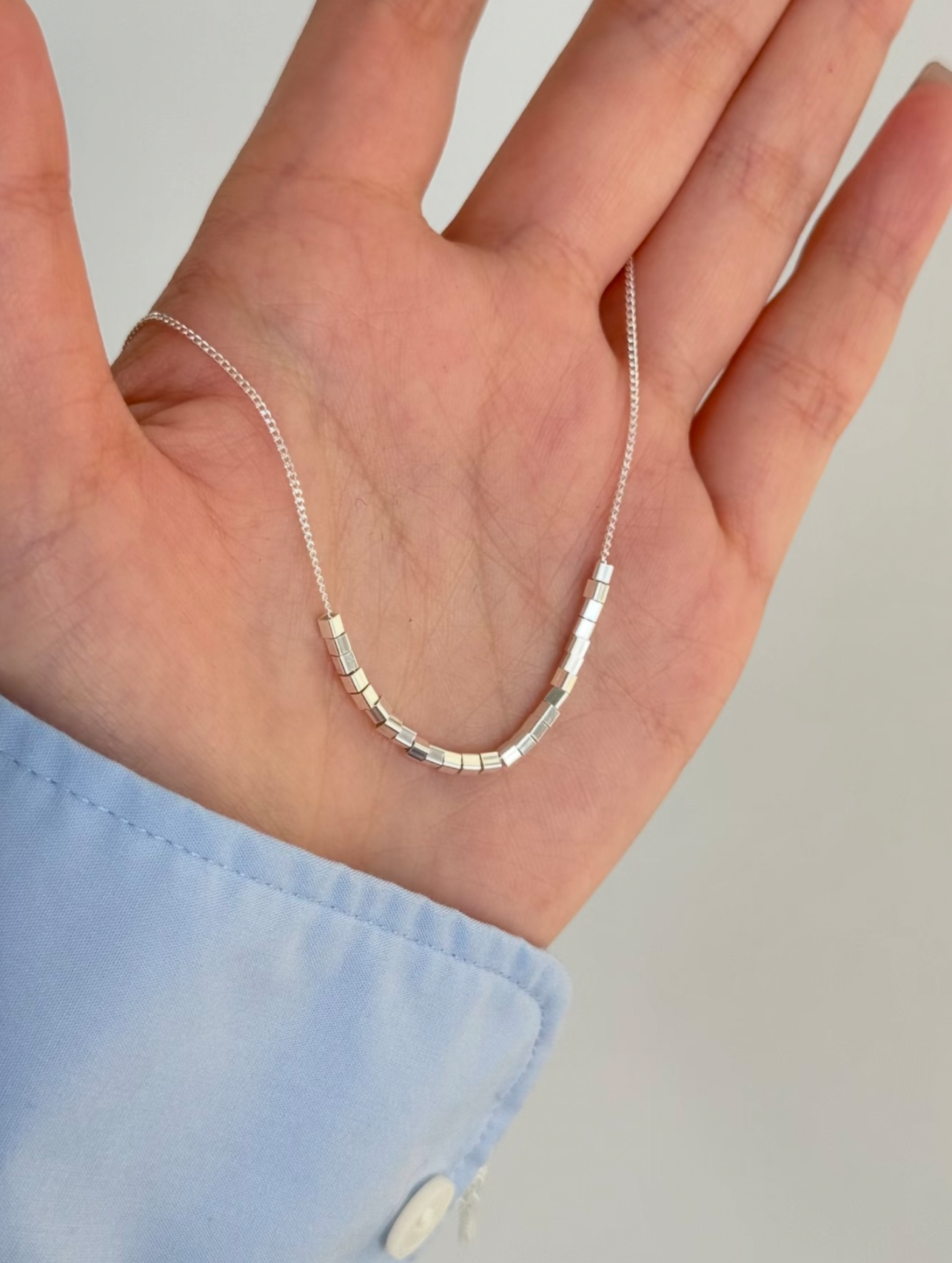 A series of small, polished metal cube beads are arranged in a subtle arc at the center of a fine sterling silver chain. Each cube has defined edges and smooth surfaces, creating a tactile, sculptural effect that catches light gently.