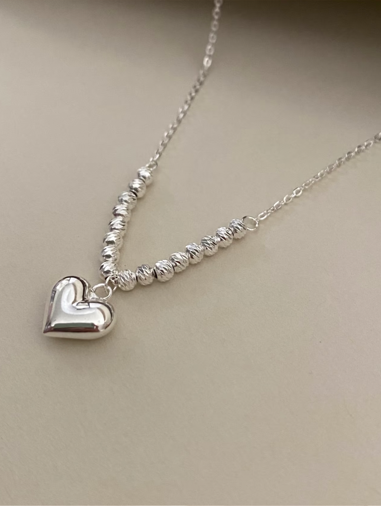 At the center rests a smooth silver heart pendant — clean in silhouette and free from excess detail. Its gentle curves reflect light subtly, creating a refined yet understated focal point.
