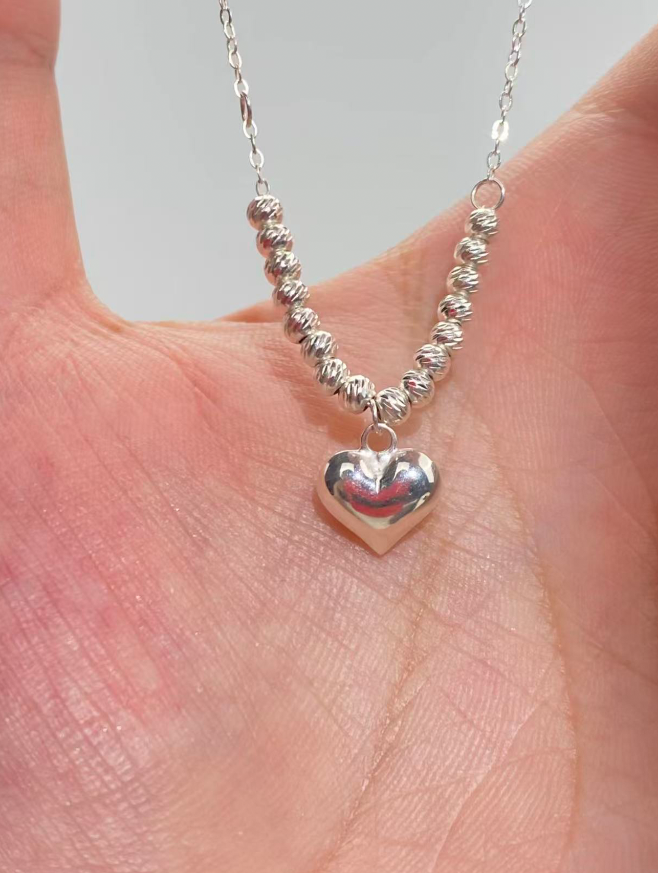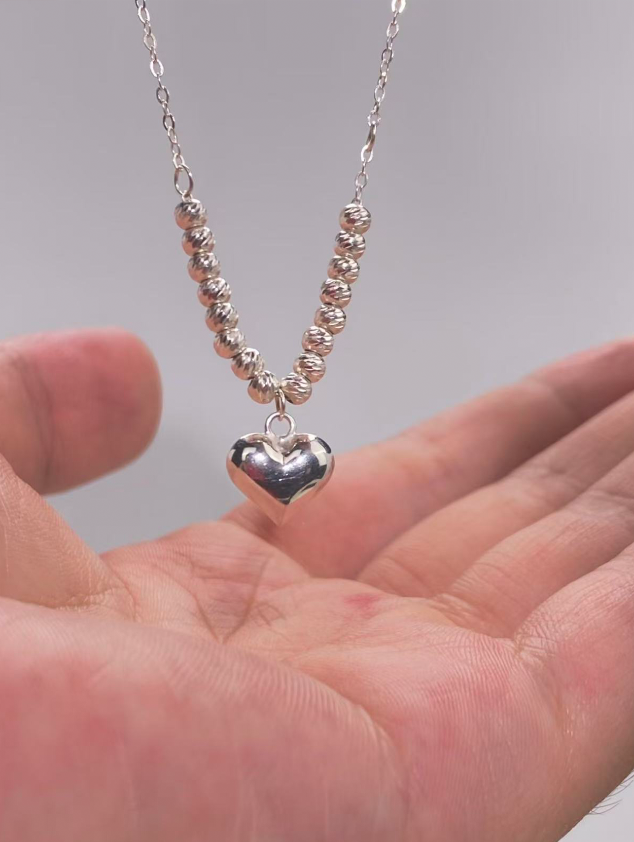 On each side of the heart, eight petite silver beads are thoughtfully arranged along the chain. The mirrored placement introduces rhythm and balance, adding dimension without overpowering the design. The beaded accents create a delicate transition from pendant to chain, enhancing the overall harmony of the piece.