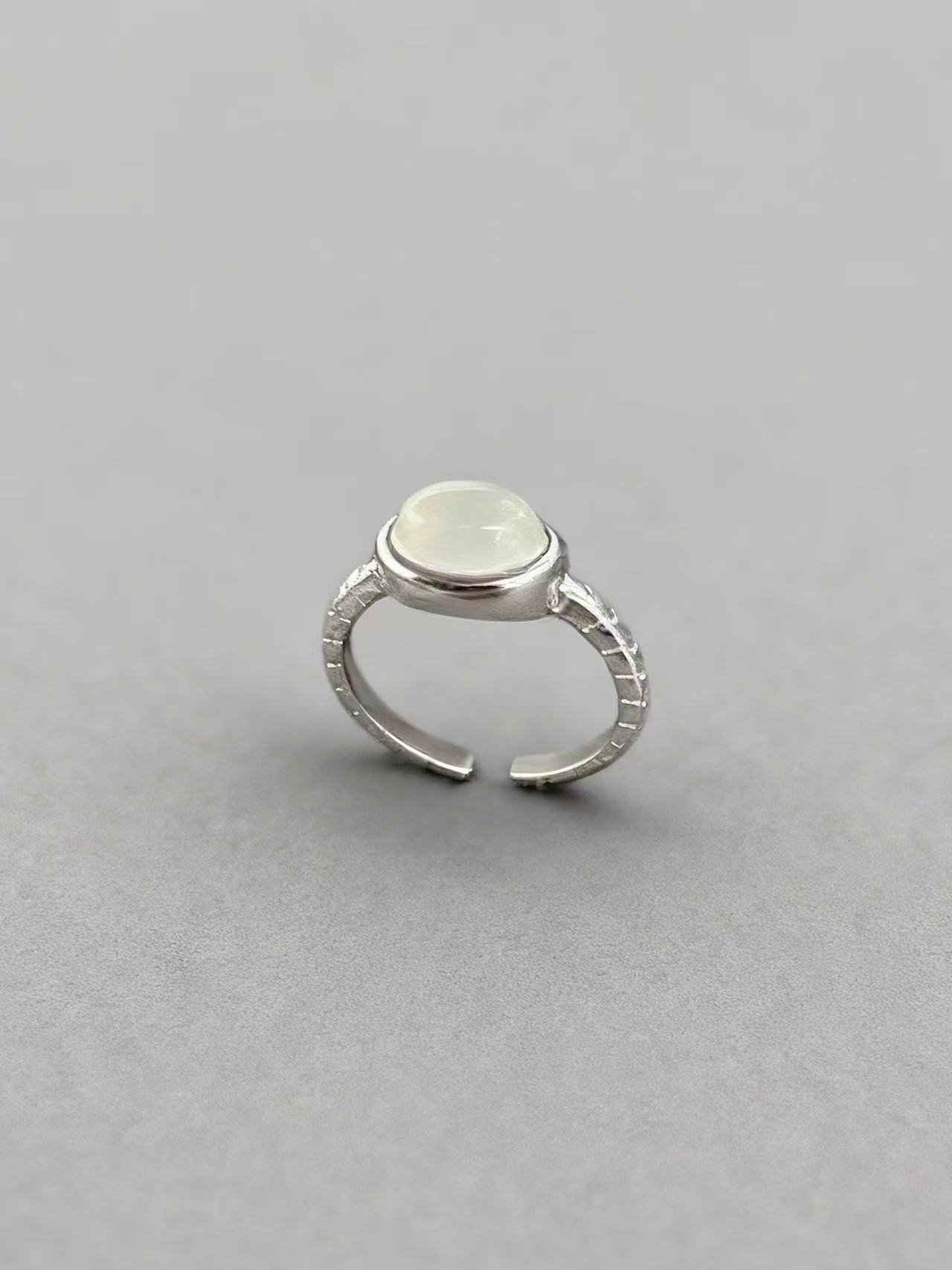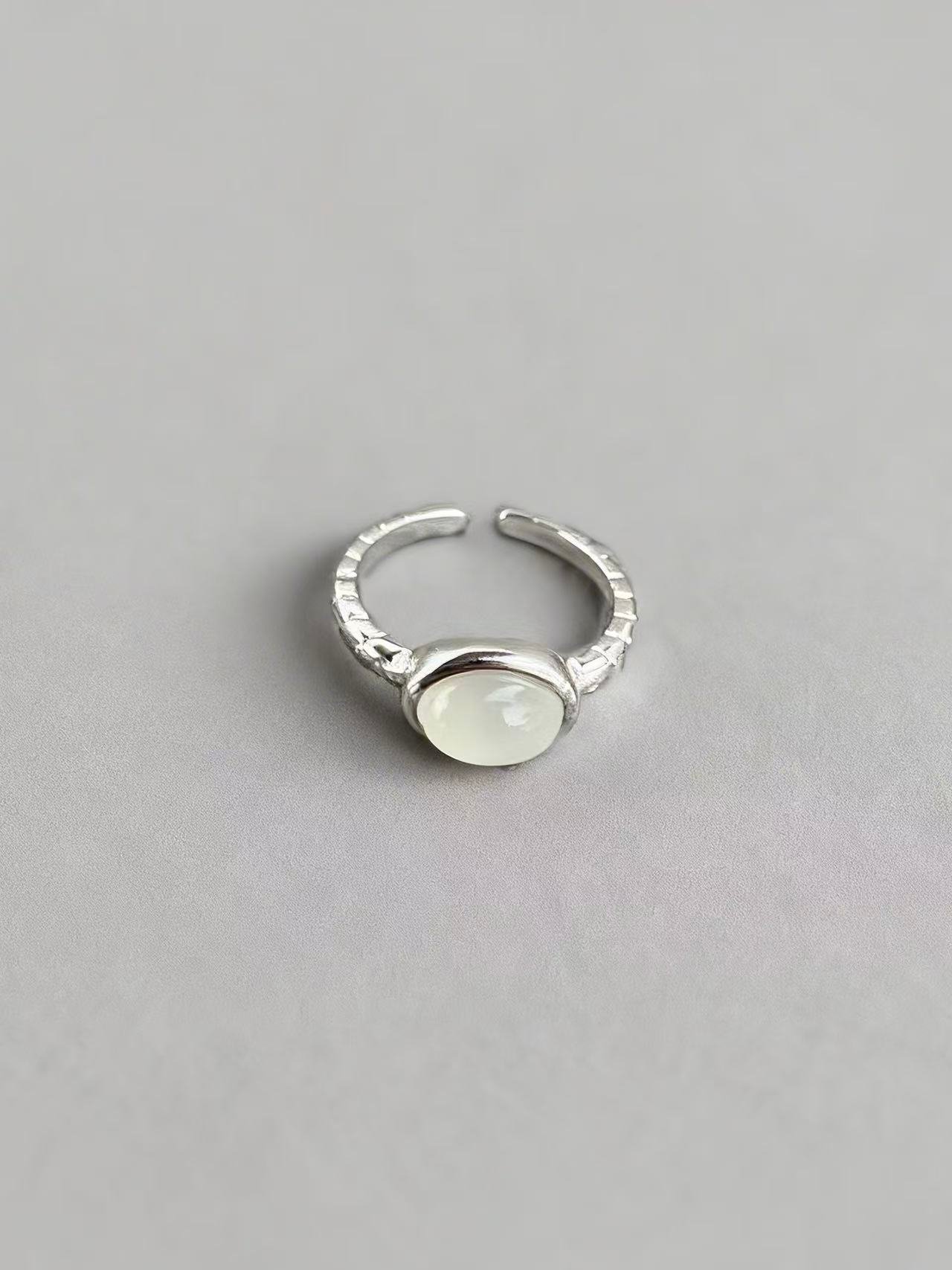 Crafted in polished sterling silver, the setting is intentionally minimal, allowing light to move freely through the stone. The adjustable open band ensures a flexible and comfortable fit, designed for everyday wear without constraint.