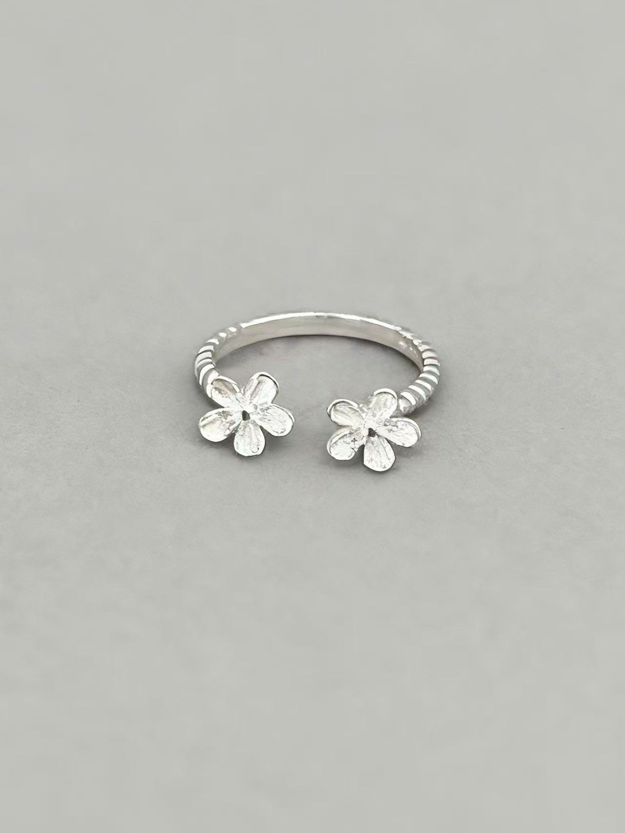 Crafted from polished sterling silver, the flowers are delicately defined yet contemporary in shape, allowing softness and structure to coexist. The adjustable open band offers a flexible fit, adapting naturally to different finger sizes while maintaining comfort and elegance.