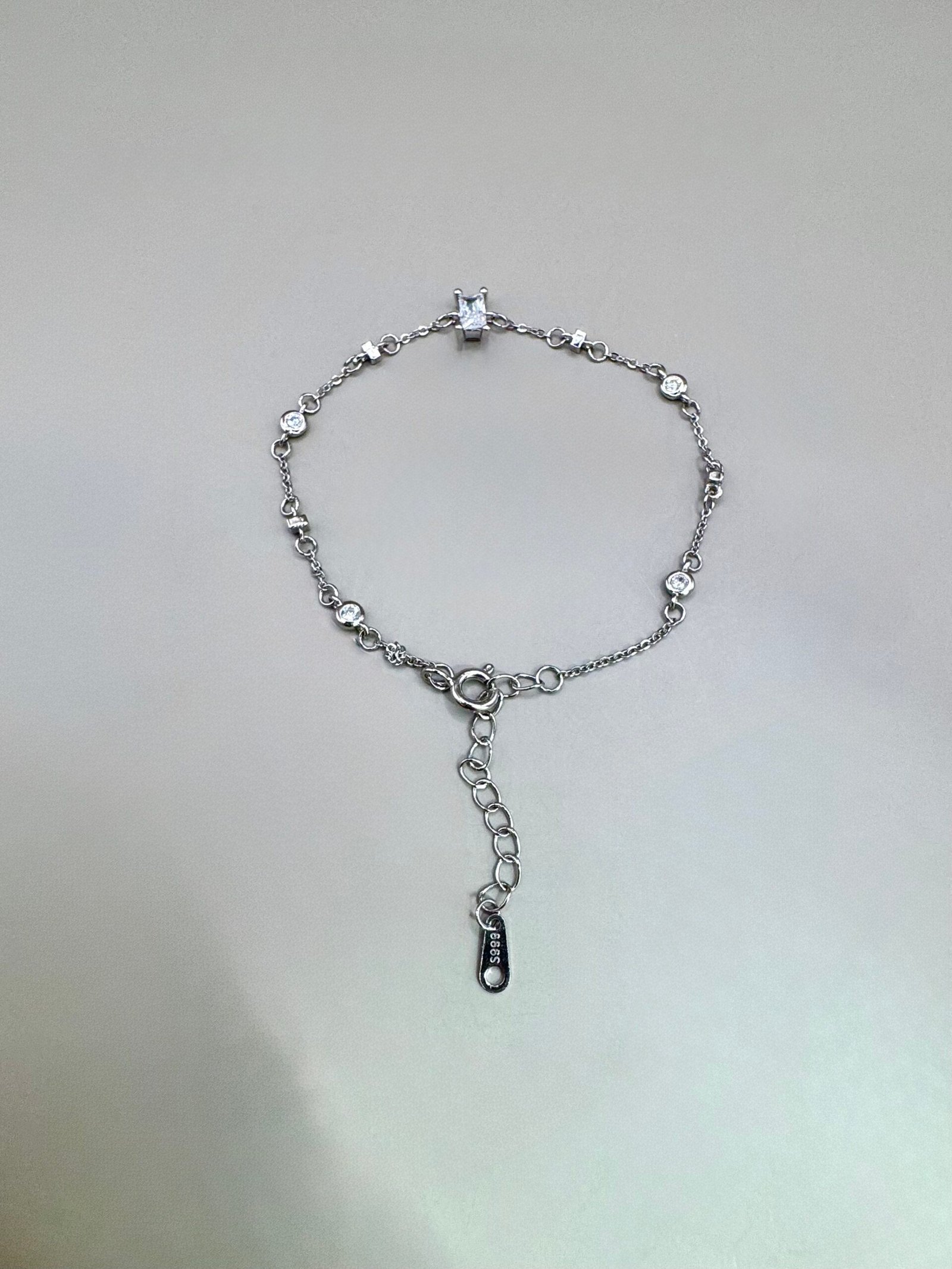 A delicate S999 silver bracelet featuring a sparkling square center stone and evenly spaced round accents — refined brilliance in a lightweight design.