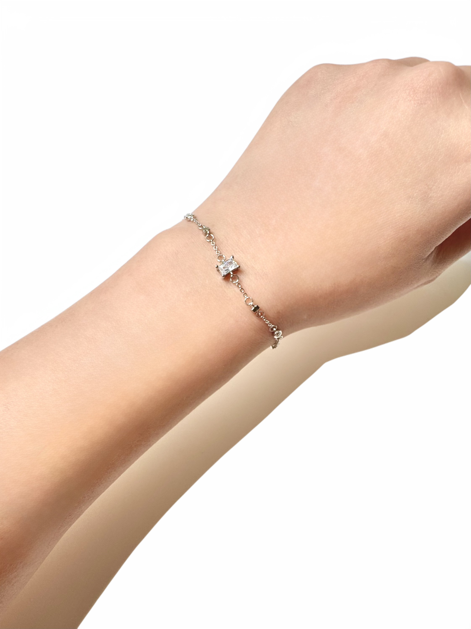 The Radiant Square Bracelet blends delicate structure with modern brilliance. Crafted from fine S999 silver, the bracelet features a slim chain composed of small, evenly connected round links, creating a clean and rhythmic foundation.