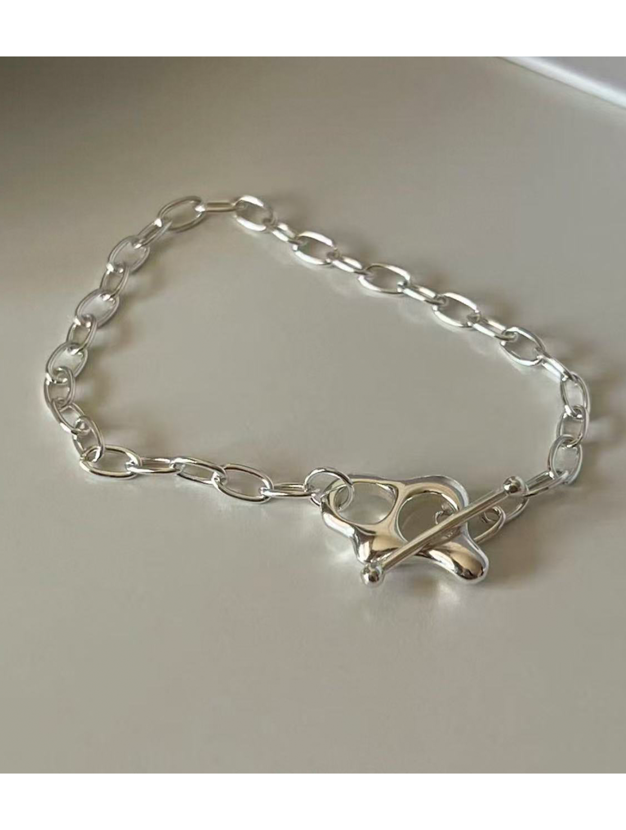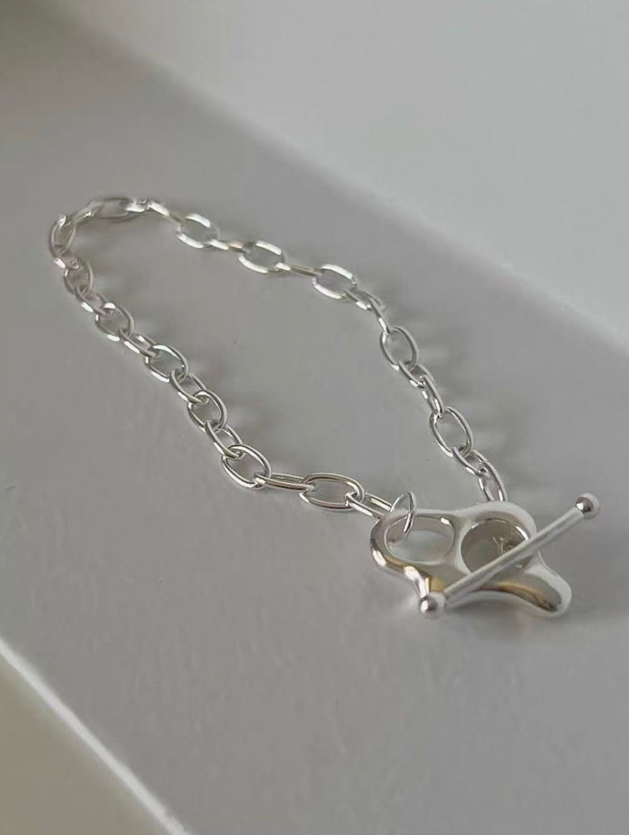 Elevate your everyday style with this modern silver bracelet, defined by its clean lines and sculptural clasp design. The chain is composed of evenly sized oval links with a slightly flattened profile, creating a smooth and balanced silhouette that feels both refined and contemporary.