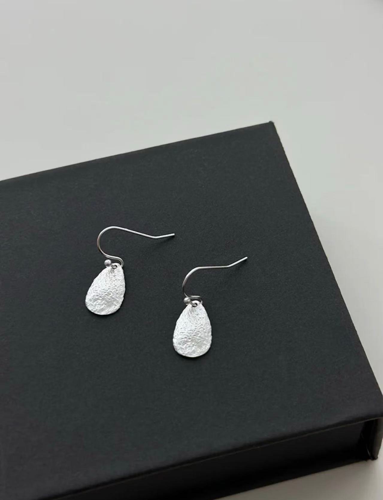Crafted in a cool-toned silver metal, the earrings emphasize the natural beauty of textured metalwork. The combination of the simple teardrop shape and artisanal surface detail gives the design a balanced aesthetic that feels both modern and naturally inspired.