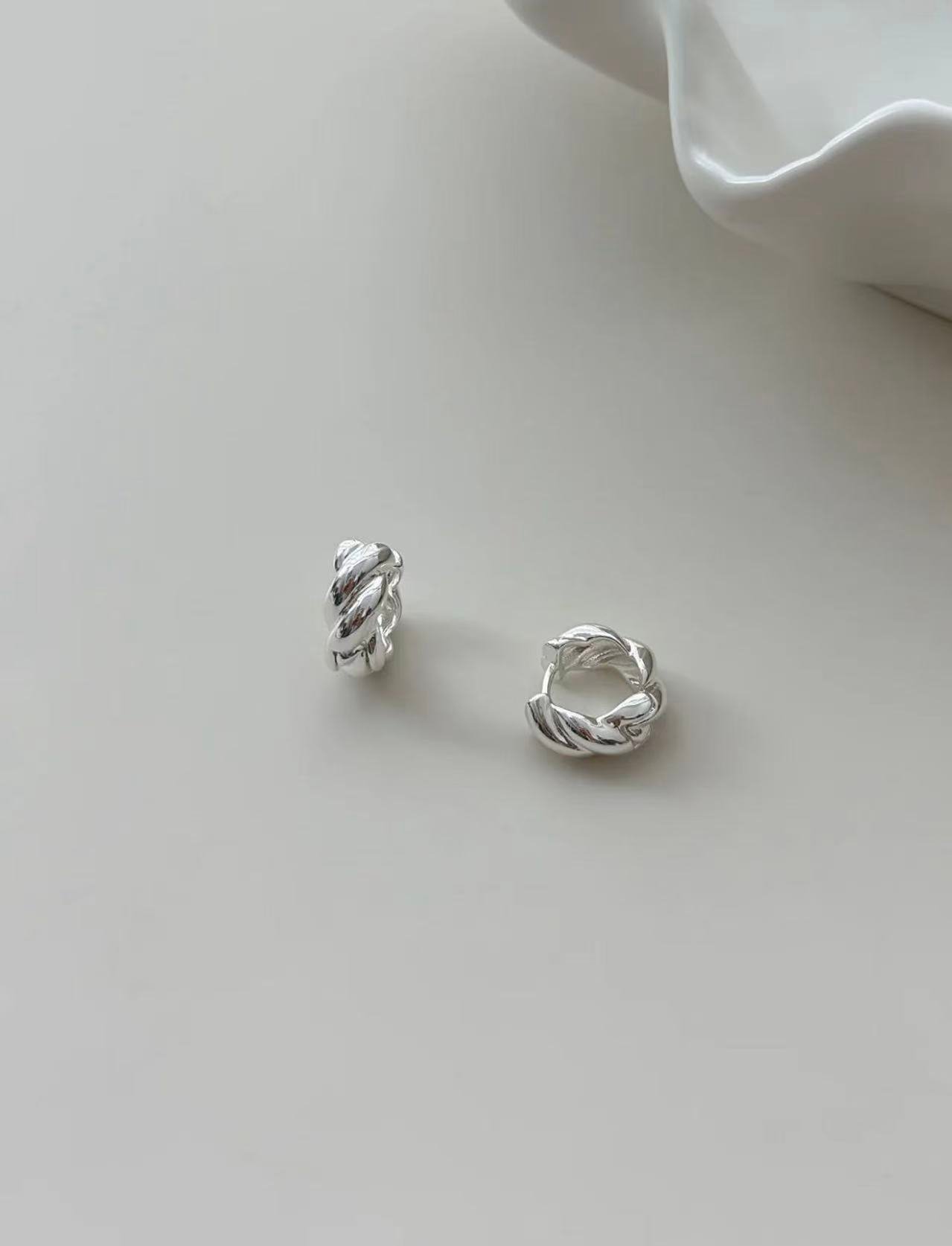 The earrings are finished in a cool-toned silver metal that complements the detailed texture. The polished surface highlights the raised edges of the twisted pattern, while the recessed areas create gentle shadow contrast, further emphasizing the layered effect of the design.